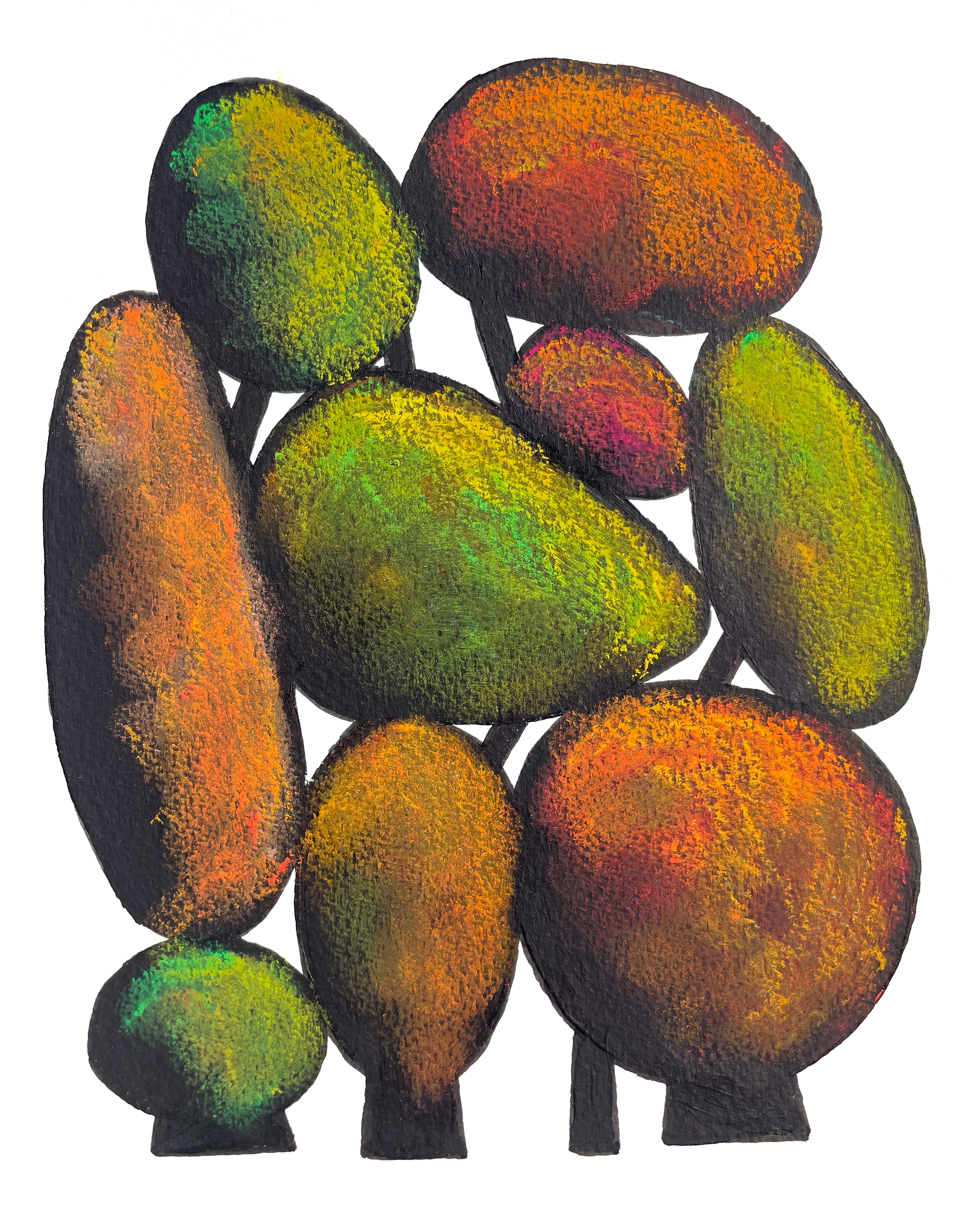 From a single set of shapes, a hundred trees emerged — each one different, each one new. At times they resemble laughing girls, or sumo wrestlers, or singers from a glamrock band, or fruits, or things without names. Like clouds that shift and suggest, these árboles imaginados invite you to look, to drift, to see again.